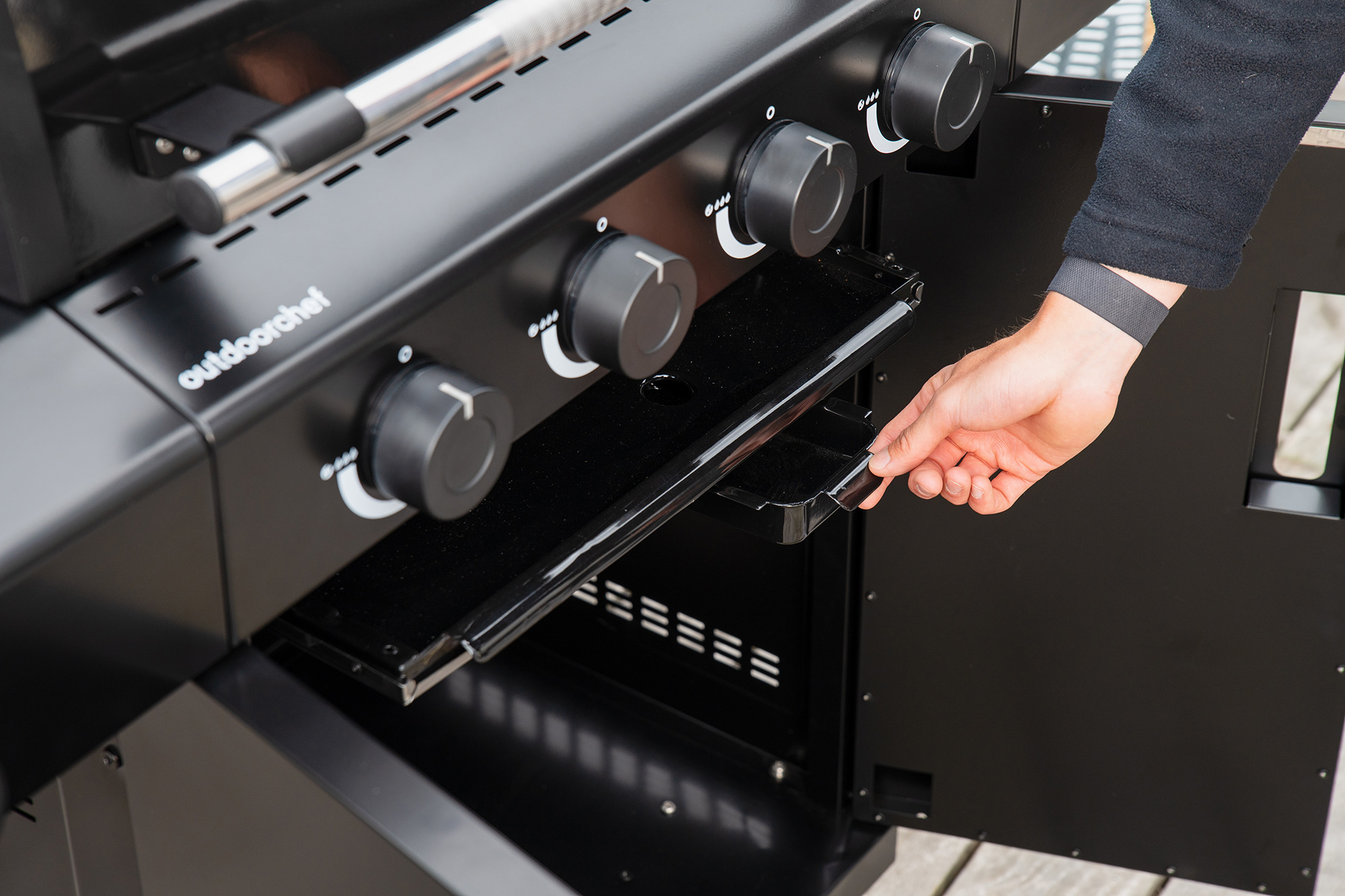 - Massive und fest montierte Seitenablagen und beleuchtete Drehregler mit Safety Light