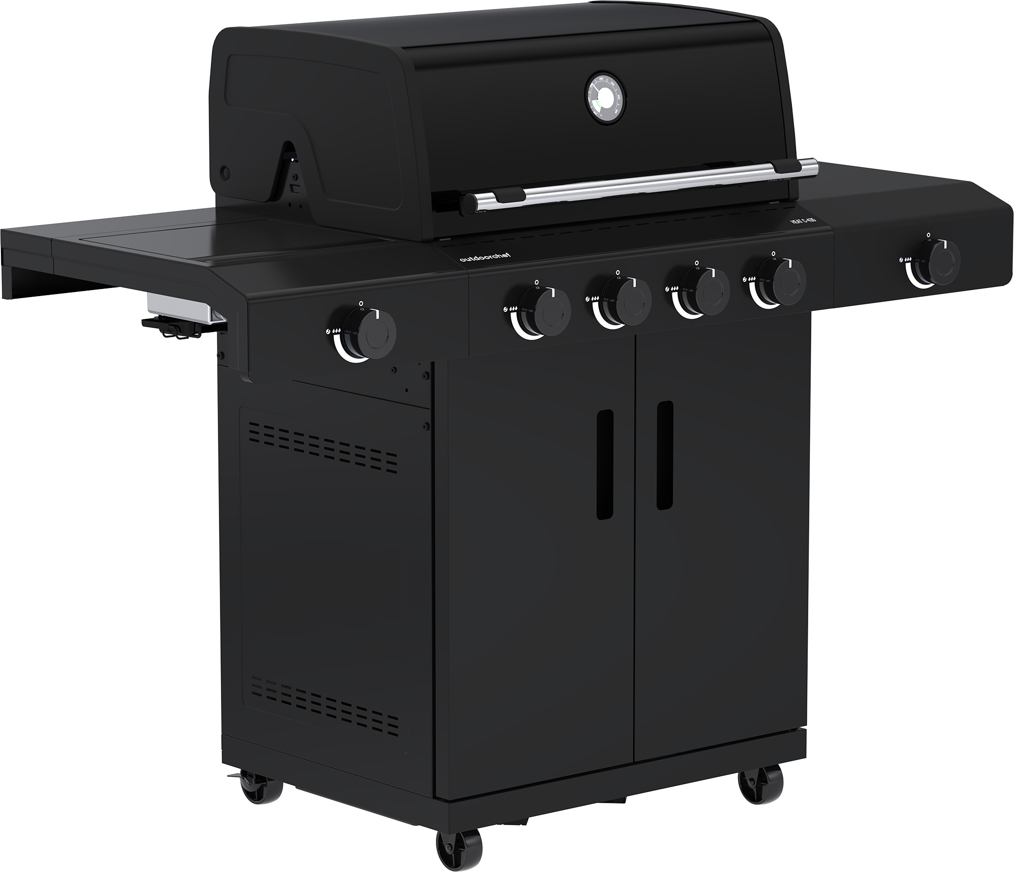 Massive und fest montierte Seitenablagen und beleuchtete Drehregler mit Safety Light, "Geräumiger Unterschrank mit Edelstahlrollen - inkl. Gasflaschenhalterung für 11 kg Gasflaschen, magnetischer Hakenleiste und Universalhalter für Zubehör