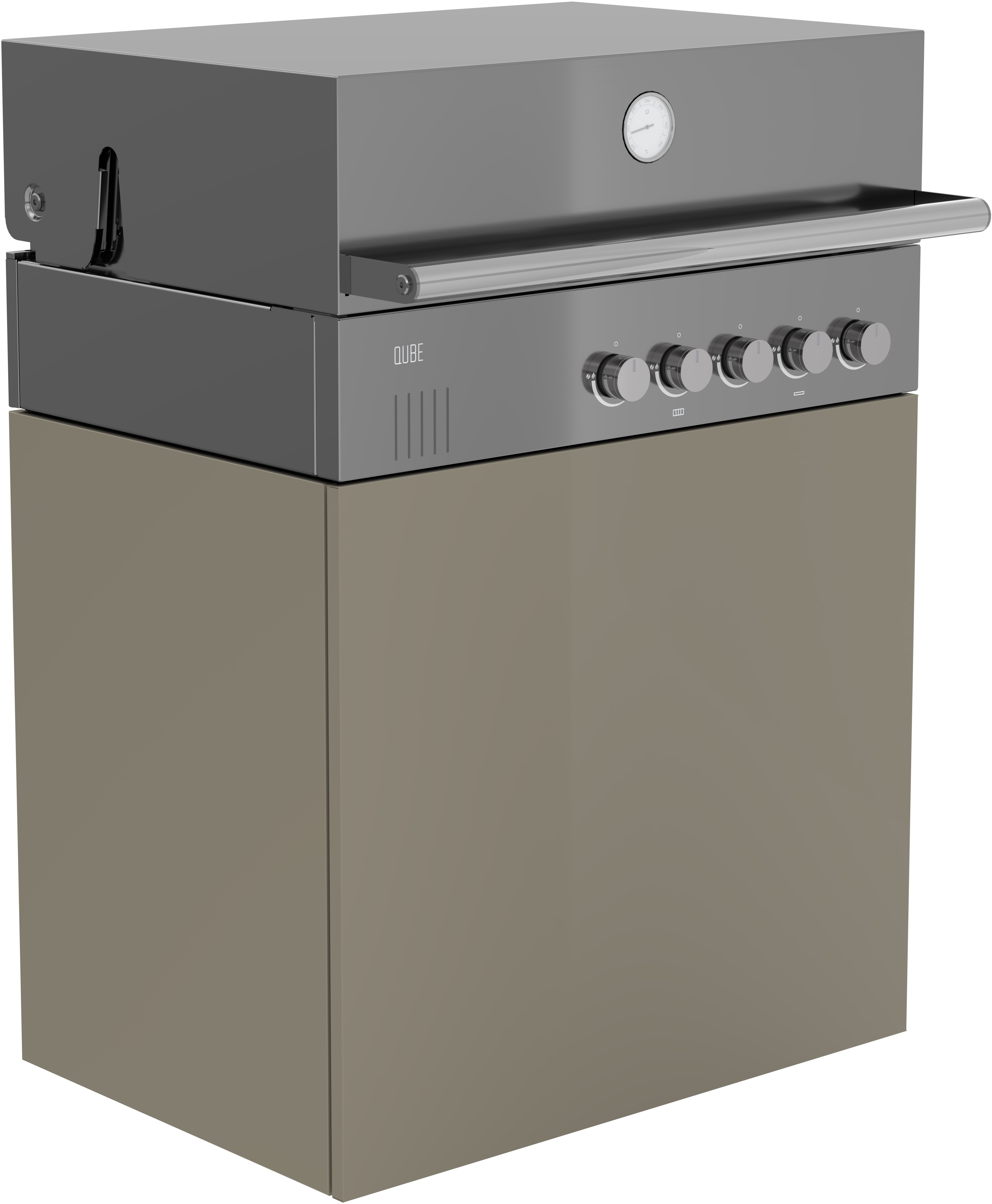 - Bestehend aus QUBE X-415 RB Einbaugrill und einem von 5 verschiedenen BBQ Unterschränken aus Edelstahl mit Pulverbeschichtung (RAL 9005 Black, RAL 3032 Red, RAL 7043 Darkgrey, RAL 9001 Creme, RAL 7006 Taupe)