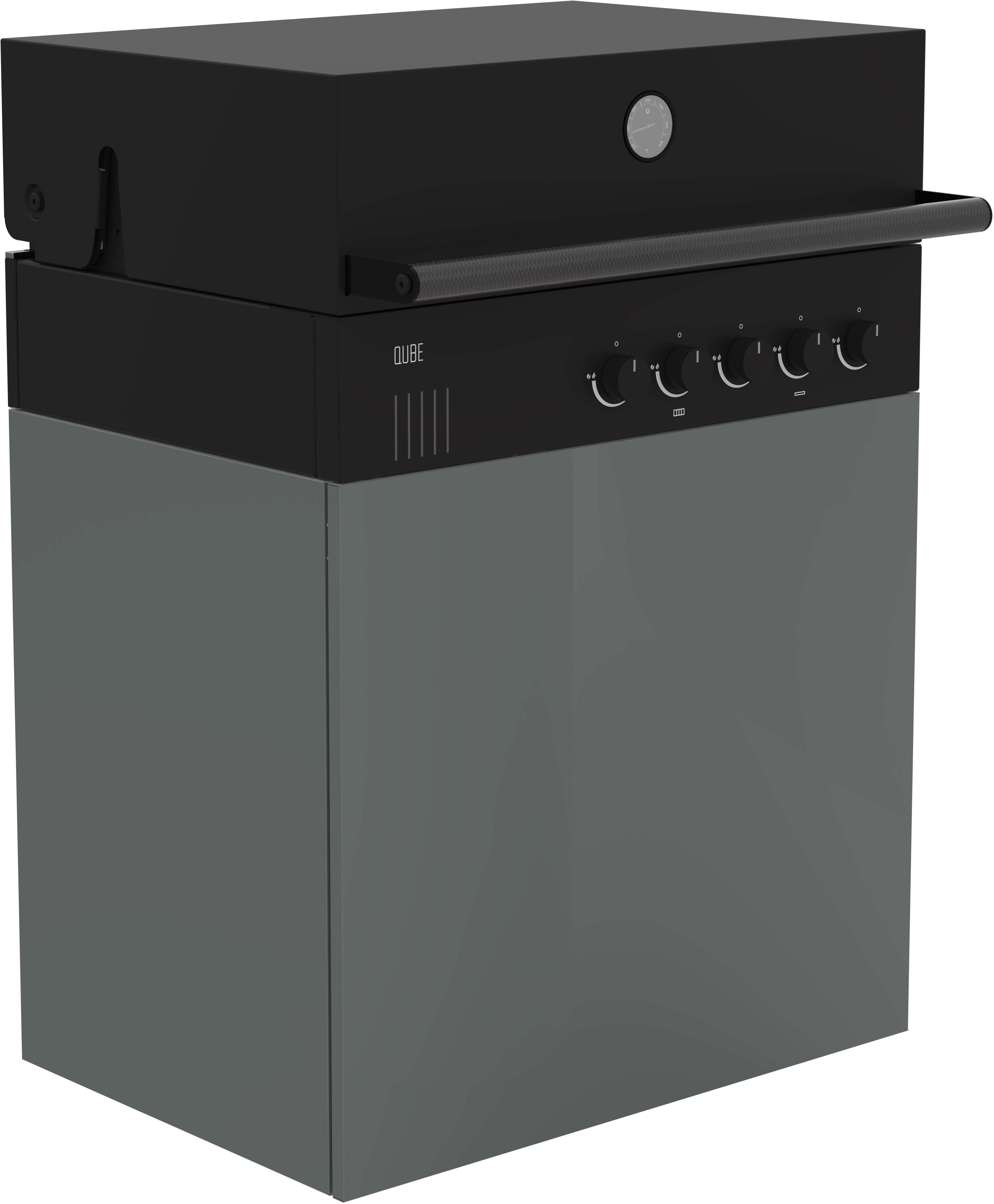 - Bestehend aus QUBE X-415 RB Einbaugrill und einem von 5 verschiedenen BBQ Unterschränken aus Edelstahl mit Pulverbeschichtung (RAL 9005 Black, RAL 3032 Red, RAL 7043 Darkgrey, RAL 9001 Creme, RAL 7006 Taupe)
