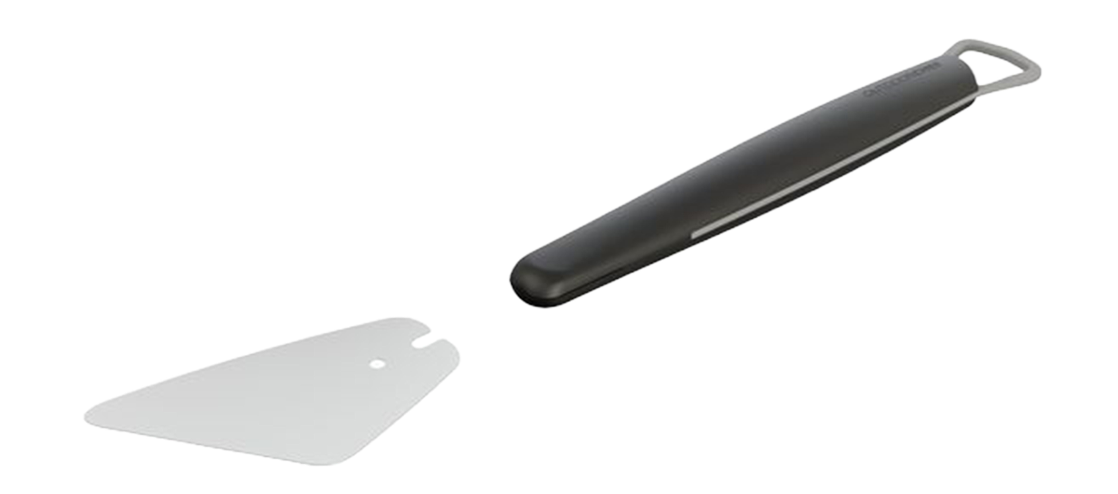 Der Trichter-Schaber macht die Reinigung des Trichtersystem noch einfacher und schneller. Die flexible Edelstahlklinge passt sich bei der Benutzung perfekt dem Radius des Trichters an und schabt dadurch besonders gründlich Verkrustungen, Fett- und Marinadenreste von der Oberfläche, ohne diese dabei zu verkratzen. Der große breite Kunststoffgriff lässt das Abschaben mühelos von der Hand gehen und eignet sich durch die integrierte große Metallöse perfekt zum Aufhängen am Besteckhaken. Die Klinge des Schaber ist austauschbar, so dass der Griff mehrfach verwendet werden kann.