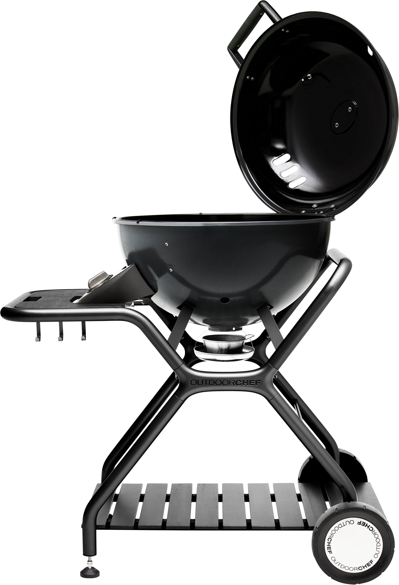 Le classique parmi les barbecues sphériques à gaz est l'Ascona 570 G ! Avec sa sphère en porcelaine émaillée, ses 2 brûleurs circulaires réglables séparément (9,7 kW) et son système d'entonnoir breveté avec technologie Gourmet Burner, il offre tous les points forts techniques des barbecues à gaz sphériques Outdoorchef. L'immense plage de températures de 80 °C à 500 °C, associée au système d'entonnoir breveté, permet une diversité maximale de méthodes de préparation, ce qui fait que l'Ascona convient pour bien plus que des grillades ! Lors de la cuisson indirecte sur toute la surface, le système d'entonnoirs permet d'obtenir une circulation de la chaleur particulièrement homogène (jusqu'à 360 °C maximum) et, lors de la cuisson directe, même jusqu'à 500 °C sur la grille de cuisson. La particularité : le système d'entonnoir fonctionnel protège à 100 % contre les feux de graisse ! Le confort nécessaire est assuré par une charnière de couvercle en aluminium moulé sous pression, judicieusement placée. L'angle de 135 ° permet d'ouvrir et de fermer facilement le couvercle d'une seule main depuis l'avant du barbecue. Grâce à son châssis stable, le barbecue sphérique est mobile et transportable et offre même suffisamment de place pour une bouteille de gaz de 5 kg ou 8 kg. L'équipement est complété par un thermomètre à couvercle pratique ainsi que par une tablette frontale avec crochets à couverts pour les petits accessoires tels que les ustensiles de barbecue, le thermomètre et autres. Le barbecue Ascona offre également des détails pratiques pour le nettoyage. Le bac de récupération des graisses situé sous la sphère se retire et se vide très facilement, et les deux entonnoirs situés à l'intérieur de la sphère peuvent être entièrement retirés et nettoyés, ce qui est très pratique.
