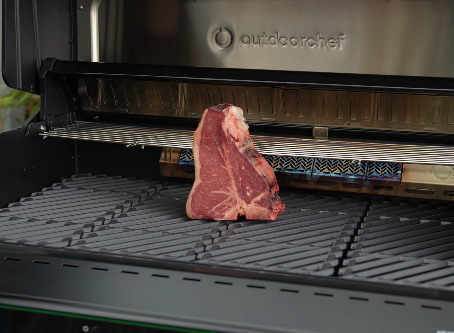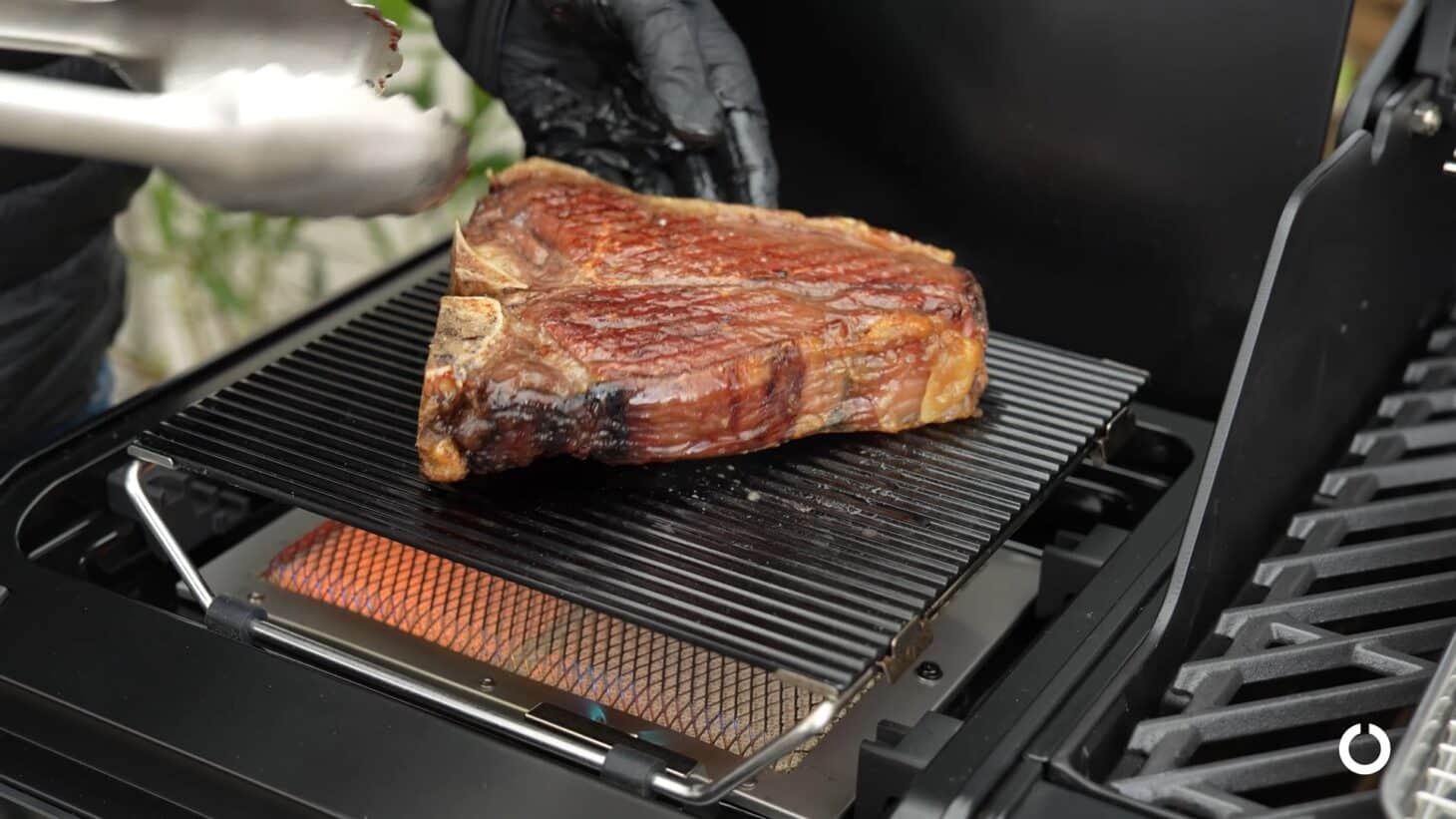 Statt Porterhouse funktionieren Rumpsteak, Ribeye oder Schweinekotelett (je 3–4 cm dick) auch wunderbar. Blazingas: glatte Seite ideal für Garnelen oder Jakobsmuscheln als schnellen Zusatz. Geriffelte Seite für mehr Struktur im Branding. Wer mag, glasiert das Fleisch nach dem Sear kurz mit Butter & Kräutern (off heat).